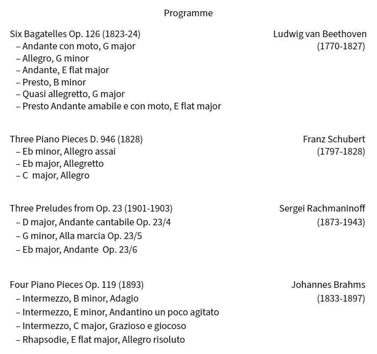 Each of these forms brings rich narration into a short, complex space, yet they are quite distinct in their characteristics. Among the composers Marialena will play, some had lived in Vienna and others from far away were influenced by its music. Many of the compositions also happen to be from late in their lives, in a sense, their last pieces of wisdom.